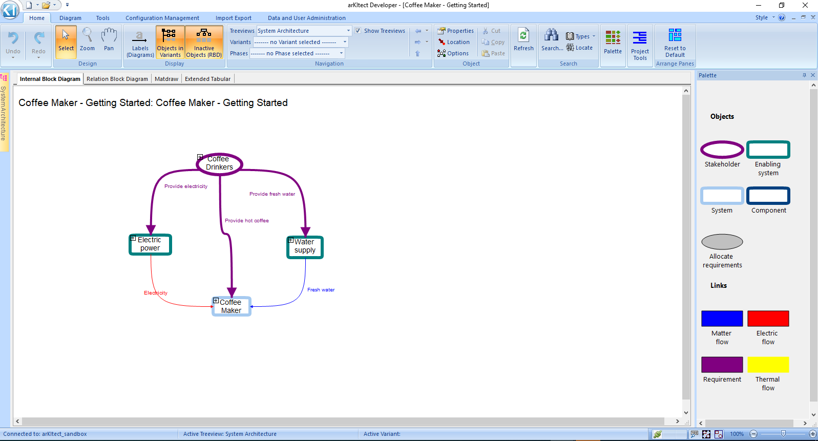 The Coffee Maker - Getting Started project opens on the following view. In this project, a generic coffee maker has been modeled. Both the physical components of the system (objects of type System and Component) as well as the Stakeholders and their Requirements have been represented.