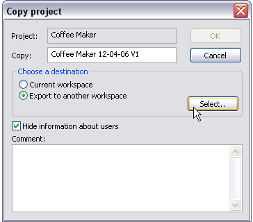 Now, a copy of the project has been created; however, the original project is still open (and we are still in the original workspace). Close the project via Main button(File) → Close. You can now log on to the destination workspace by going to Main button(File) → Workspace → Change Workspace or simply using Ctrl+W shortcut. Open the copy via Main button(File) → Open or simply using Ctrl+O shortcut.