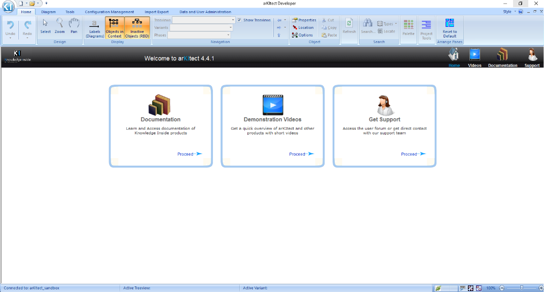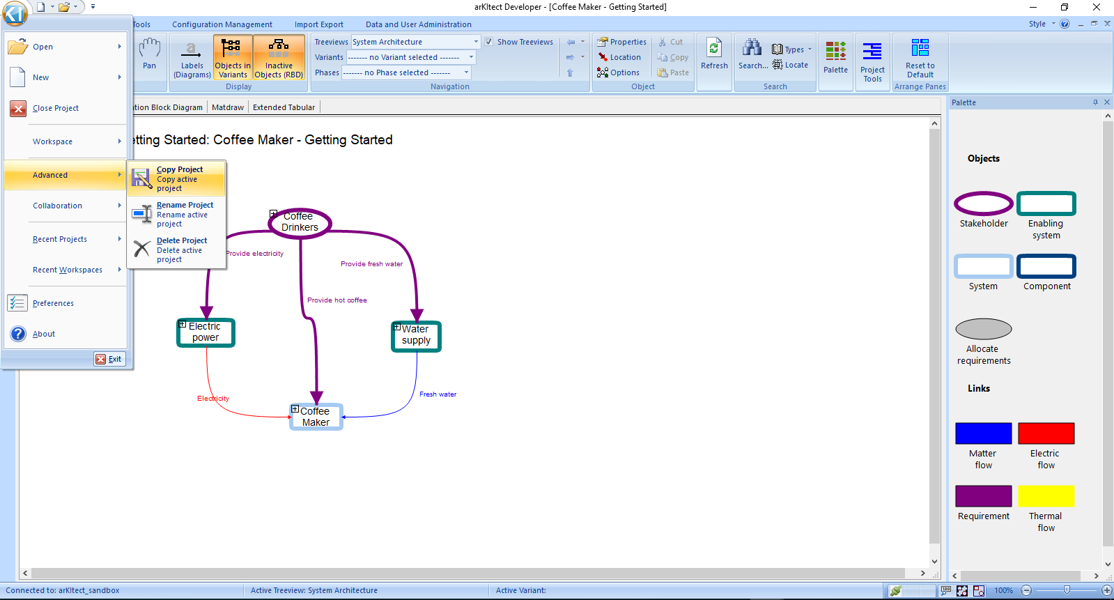 We begin this tutorial by starting arKItect and opening the Coffee Maker - Getting Started project in workspace Demos. This workspace is one of the workspaces created automatically for every user.